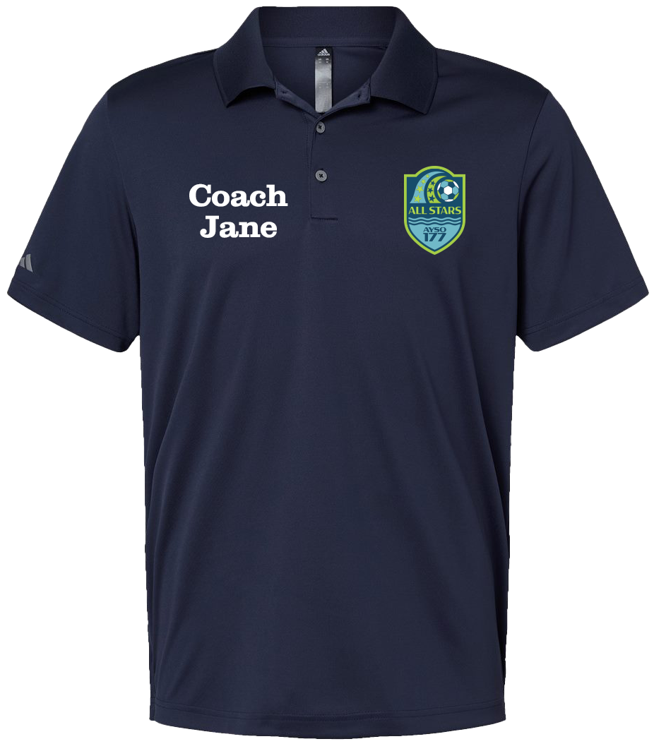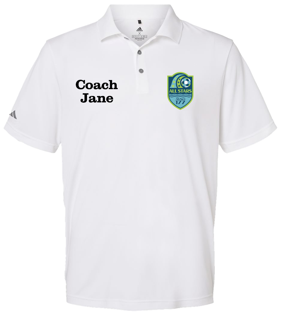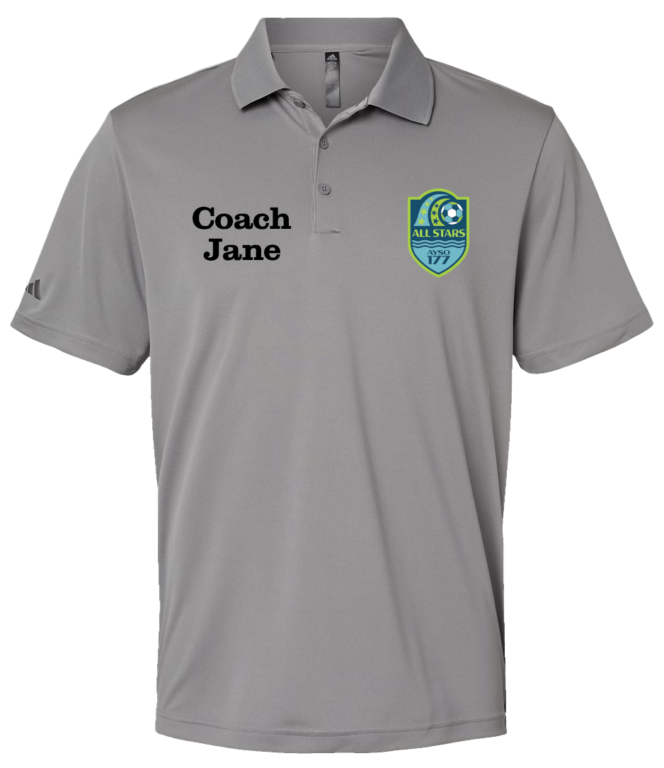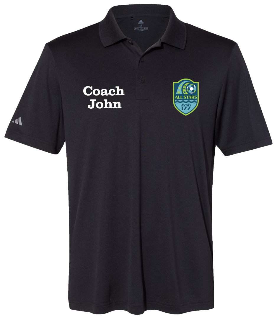 Adidas Coach Polo with LB All Stars Logo and optional name. The word “COACH” is optional. Please add “COACH” with the name or shirt will be printed with the only what is entered into the name field. ie “COACH JANE” vs “JANE”